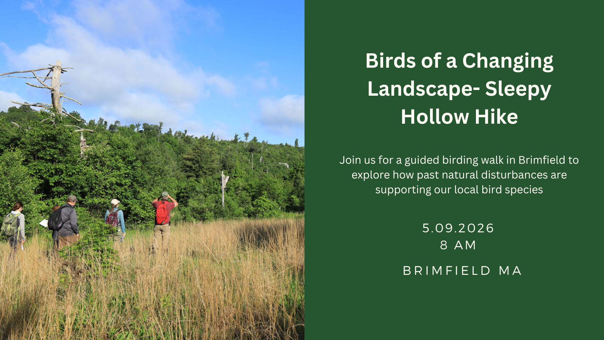 Shaped by the 2011 tornado, this area in Brimfield offers a powerful example of how forest regeneration after natural disturbances can support local bird communities and enhance biodiversity across New England. We hope you’ll join us to discover the many birds that call this special place home.