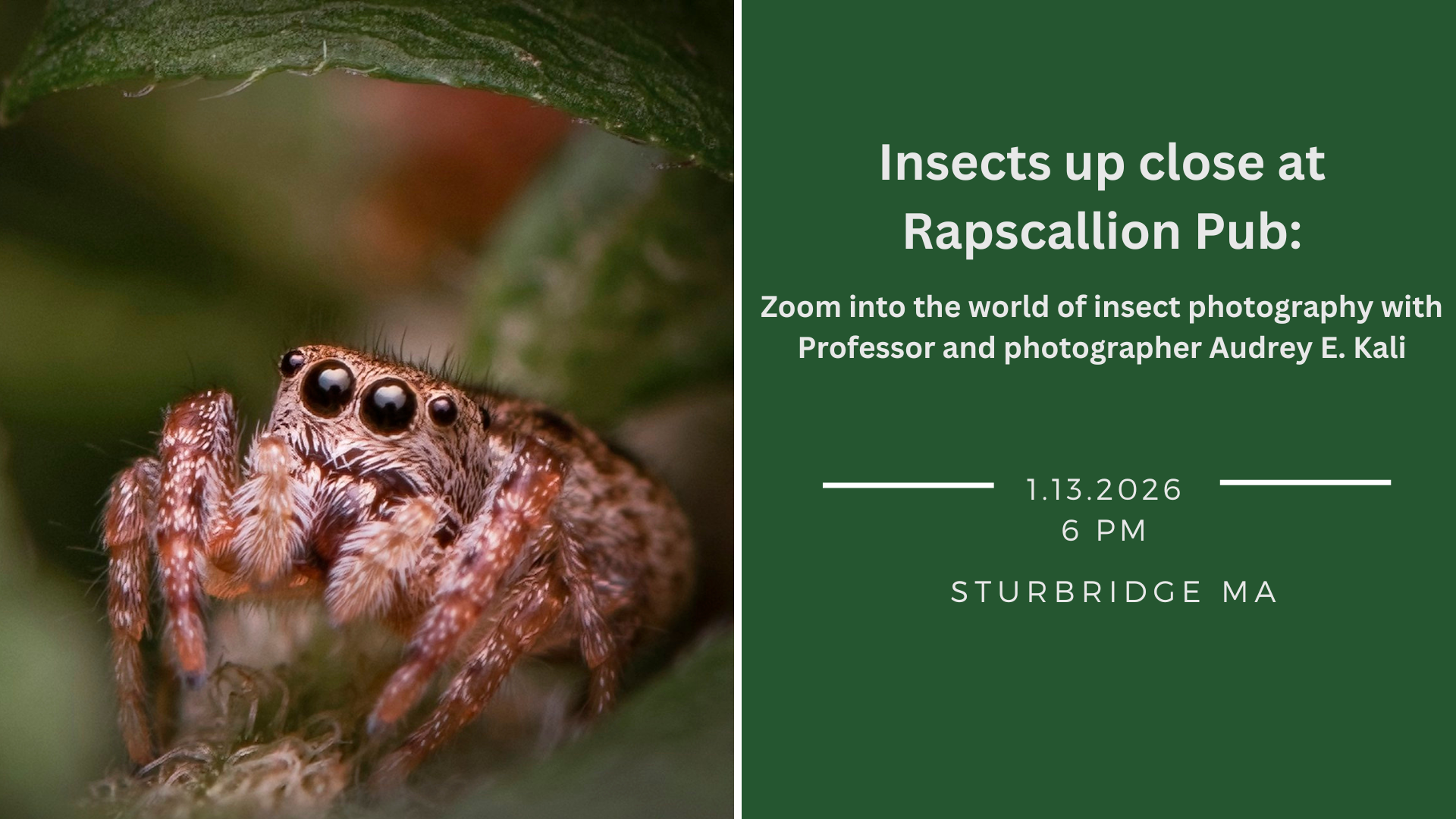 Join New England-based macro-photographer Audrey E. Kali, as she displays her fascinating insect photography and shares insight from her research, focused on the diverse insects of Massachusetts. Audrey is a professor in the Communication Department at Framingham State University, teaching science communication. She uses her photography skills to connect people with the world around us, allowing us to see our own backyards in ways which we cannot always view through our own eyes. Her work gives us a close-up view on the importance of biodiversity within our insect communities and the crucial roles they play within our ecosystem. Get to know your backyard neighbors up close and personal, this is an event you do not want to miss! Doors open at 6, talk to begin at 6:30 PM.