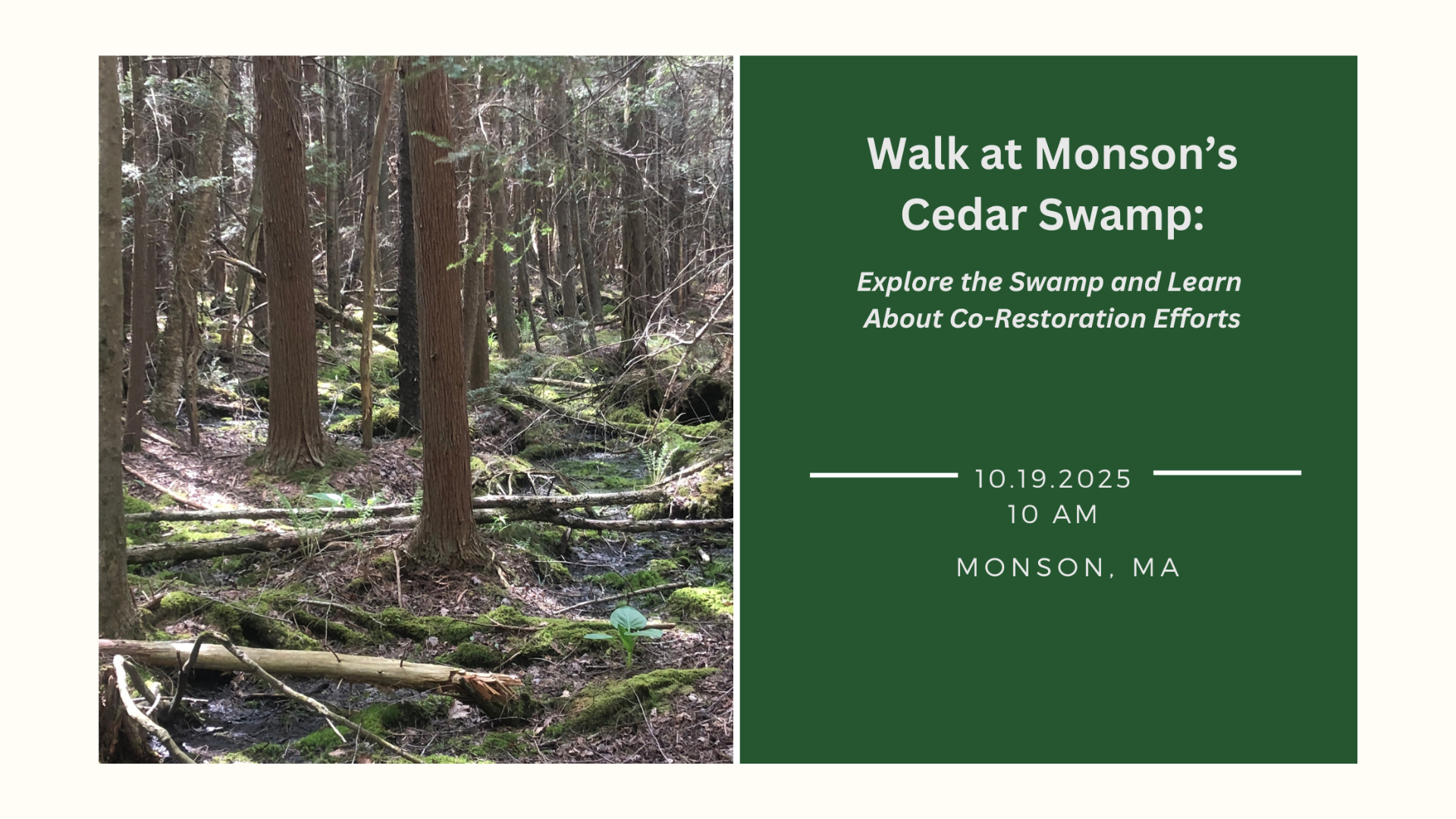 Join Opacum Land Trust’s Vice President Toni Uliana and director Glenn Colburn for a walk at the Atlantic White Cedar Swamp in Monson to discuss the ecological restoration work led by the Monson Conservation Commission in collaboration with the Nipmuc tribe of Native Americans and with support from Opacum Land Trust. The walk will follow the Cedar Swamp Trail around the swamp. The trail is approximately 1.5-miles in length with a firm trail, and ends with a ¼-mile road walk back to the parking area. The majority of the trail is an easy walk, but expect some sections of uneven ground and roots. We will stop numerous times along the trail to examine the local plants and discuss the declining health of the cedar swamp and what Monson and the Nipmucs intend to do to restore the swamp to a more healthy and vigorous condition.
