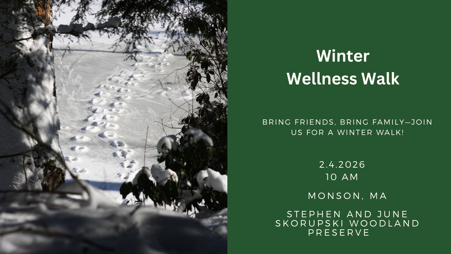 Join TerraCorps Service Member Emma Comeau for a Winter Wellness Walk in Monson! We welcome everyone of all ages to get out of the house and get out on the trail with us. The winter can be long and challenging, but it doesn’t have to be! This is a great opportunity to get active and meet others in the community who share a love for the outdoors.